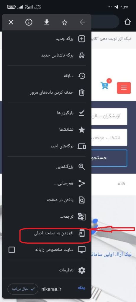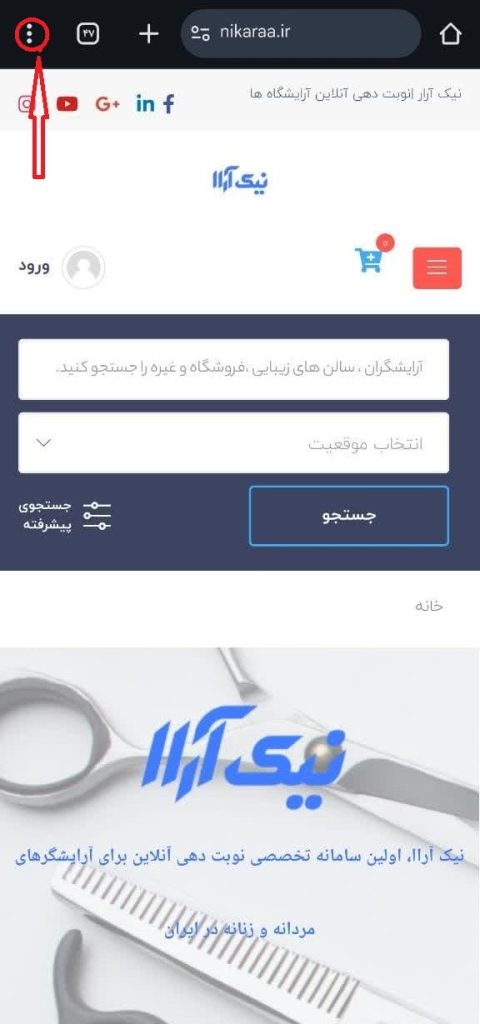 برای نصب و فعال سازی اپلیکیشن pwa نیک آراا ابتدا وارد سایت نیک آراا شده و از قسمت بالا در در مرور گر خود سه نقطه منوی مرور گر خود را فشار میدهید .